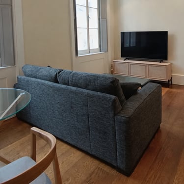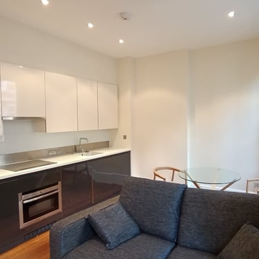 A stylish one‑bedroom apartment for rent in the very heart of London, located in a historic building with high ceilings and original features. The spacious living room is filled with natural light and furnished with modern, sleek pieces, creating a cosy space that can be easily adapted to any interior style chosen by the future tenant.